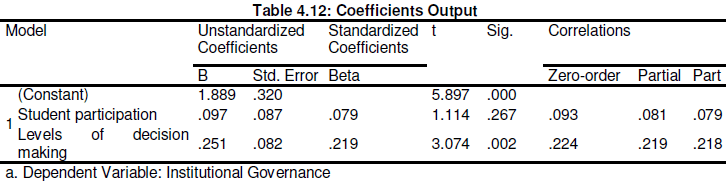 From the output box of coefficients, a look at the Beta values under standardized coefficients reveals that each aspect of extent of student involvement in management contributes differently to the model, as shown in Table 4.12.