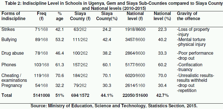 Records at Siaya county education office show that the number of reported indiscipline cases in the sub-counties is higher than the national average level (Table 2).