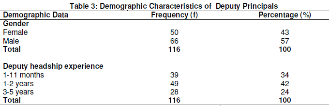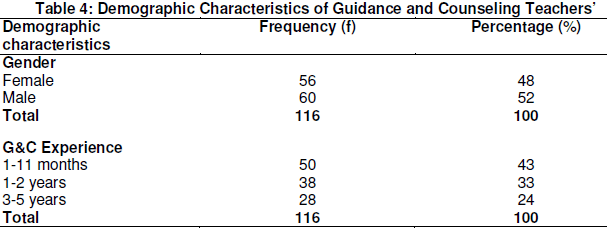 Table 3 shows that 50 (43%) deputy principals were females, while 66 (57%) were males. Table 4.1 also shows that 39 (34%) deputy principals had experience of 1-11 months, 49 (42%) had experience of 1-2 years and 28 (24%) had experience of 3-5 years as deputy principals. Table 4 shows G&C teachers demographic characteristics.