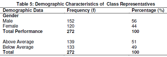 Fifty six (48%) Guidance and Couselling teachers were females, while 60(52%) were males. Table 4.2 also shows that 50(43%) Guidance and Couselling) teachers had experience of 1-11 months as Guidance and Couselling teachers and 38(33%) had experience of 1-2 years, while 28(24%) had experience of 3-5 years. Table 5 shows class representatives demographic characteristics.