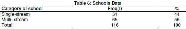 Large student populations are more difficult to control than smaller populations. The schools were therefore categorized according to size. Table 6 shows that 51 (44%) schools were single stream schools and 65 (56%) schools were multi-stream schools.