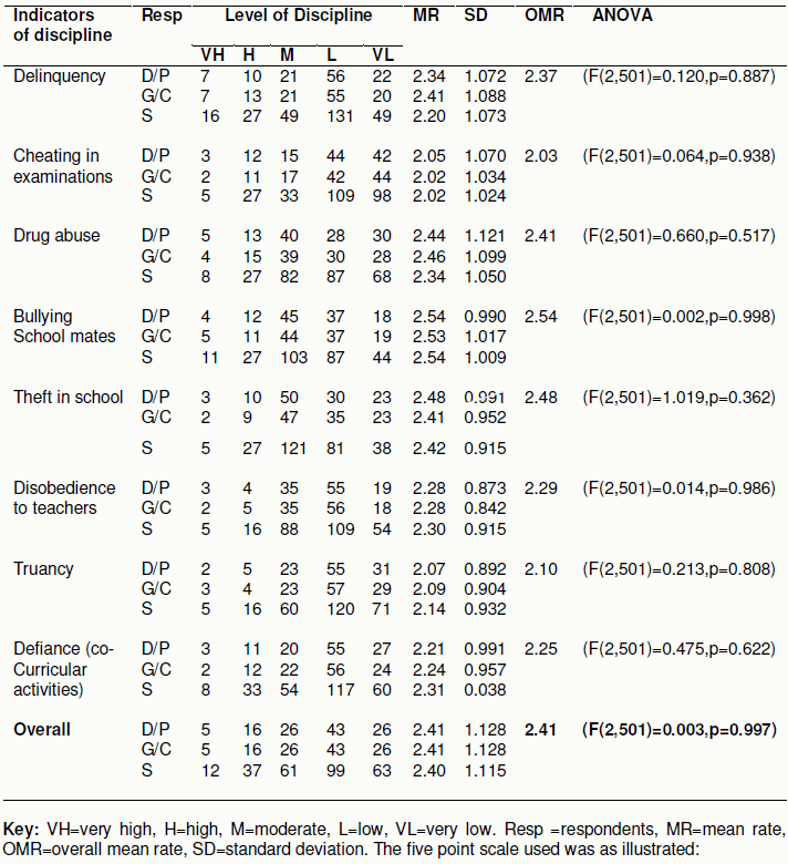 The hypothesis that was used to establish the influence of mental harassment ban on student discipline was: “There is no statistically significant relationship between mental harassment ban and students discipline in public secondary schools.” The first step in data analysis involved descriptive analysis of the stress levels among students and the level of mental harassment ban in the three sub counties. Thus, to establish the influence of mental harassment ban on student discipline, the students’ discipline level was first established. The results were as shown Table 7.