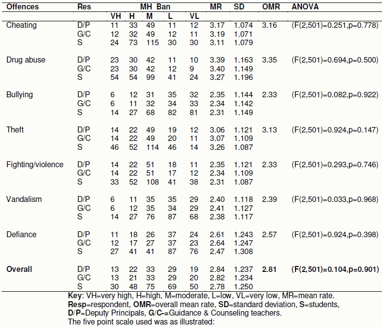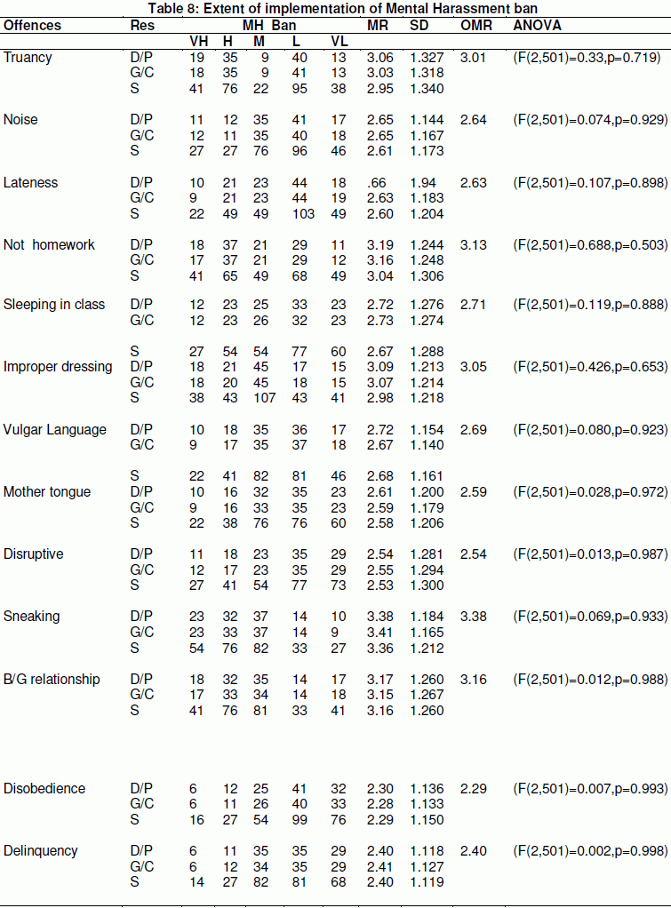 Deputy principals, guidance and counseling teachers, and class representatives rated the extent of mental harassment implementation as moderate with respect to sneaking . This indicates that mental harassment is moderately used to control sneaking. Sneaking is a major offence and students who sneak from school are suspended from school (Gikonyo, 2002). Deputy principals, guidance and counseling teachers and class representatives rated the extent of mental harassment implementation to be moderate, with respect to its use to control drug abuse. This indicates that mental harassment is moderately used to control drug abuse. Students who take drugs are usually sent home to call their parents (Gikonyo, 2002). Deputy principals, Guidance and Couselling teachers and class representatives rated the extent of mental harassment ban implementation at moderate with respect to its use on students who do not do homework. This indicates that mental harassment is moderately used to punish students who do not do homework. Deputy principals, Guidance and Couselling teachers and class representatives rated the extent of mental harassment ban implementation at moderate with respect to truancy. This indicates that mental harassment is moderately used to control truancy. Truancy is a minor offence in school. With mental harassment ban, teachers tend to ignore minor offences like truancy (Miriti, 2008, Mophosa & Shumba, 2010).