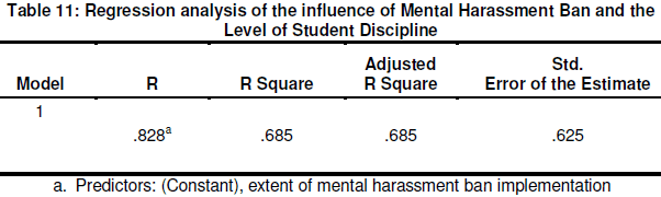 From Table 11, it can be observed that mental harassment ban accounted for 68.5% of variation in student disciple line as signified by the Adjusted R square (R2) .685. This implied that 68.5% of the total variance in the level of student discipline was accounted for by mental harassment ban. The other 31.5% was due to other factors.