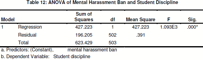 From Table 12, it can be noted that mental harassment ban was a predictor of student discipline (F (1, 502) 1.093, p<.05).