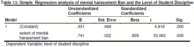 To establish the actual influence mental harassment ban on student discipline, simple regression was computed. The results were as shown in Table 13.