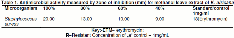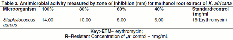 K. africana plant extracts has many medicinal properties due to the presence of numerous secondary metabolites e.g. iridous, naphthaquinoid, flavonoids, coumarone, lignin’s, saponins, tannins, alkaloids, phenol etc. Some researchers demonstrated its activity as mild (Sikder, 2011). Previous investigations of K. africana have established anti-microbial activity of the leaves and stem back against S. aureus, E. coli and Candida albicans (Akuyili, et al., 1991; Kwo and Craker, 1996). And this also agrees with this study as ant-microbial activity against S. aureus was observed.