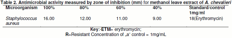 The pharmacology of A. chevalieri showed that it possesses anti-microbial, anti-histamine and mast cell stabilizing properties (Graceline, et al., 2013) and it agrees with this study on the anti-microbial activity showed by the plant extract. Also the leave extract of A. chevalieri has been reported for effective anti-bacterial and anti- candida activity from Brazilian flora (Tempone et al., 2008) because of the presence of active compounds (alkaloids, amino-acids, saponins, flavones, Quinone’s, tannins, carbohydrates) and this is also in agreement with the anti-bacterial activity exhibited by the plant extract of A. chevalieri in this study.