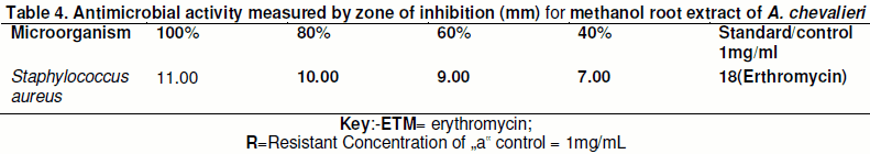 Comparing their efficacy in terms of antimicrobial activities shown by both plant extracts, one can say that both plant extracts exhibited antimicrobial activity with root of K. africana showing more activity as compared to the root of A. chevalieri (table 3 and 4).