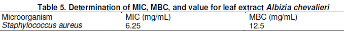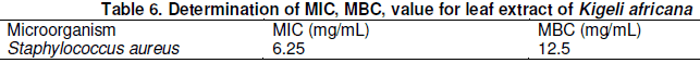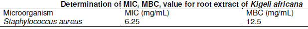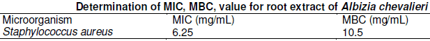 The table 5 and 6 shows the MIC and MBC value of 6.25 and 12.5 mg/mL against Staphylococcus aureus for leave extract and 6.25 and 10.5, 6.25 and 12.5 mg/mL against Staphylococcus aureus for root extract tested listed in the Table above.