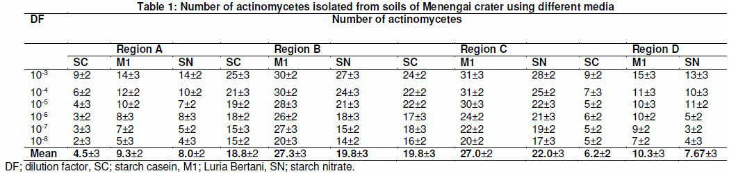 The current study indicates that Menengai crater is a fertile ground for isolation of actinomycetes (Table 1). Region B and C produced the highest number of actinomycetes compared to regions A and D. This can be attributed to the topography of the crater where region B and C are located on the lower side while regions A and D are on the upper side. This agreed with a previous study carried out in semi-arid regions of North Africa (José et al., 2017). As a result most of the actinomycetes could have been transported to the lower regions through soil erosion (Surabhi, and Srividya, 2016).