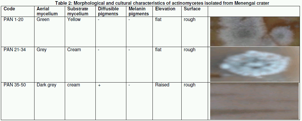 M1 agar was able to recover higher number of actinomycetes than either starch casein and starch nitrate agar (Table 1). This differs with earlier studies carried out in other parts of the word (Atta, 2015; Qais et al., 2017). The hostility of the crater in terms of growth conditions of actinomycetes may be a contributing factor. Slam et al. (2014) asserts that the growth conditions that actinomycetes are subjected to may results in change in nutrient requirements.