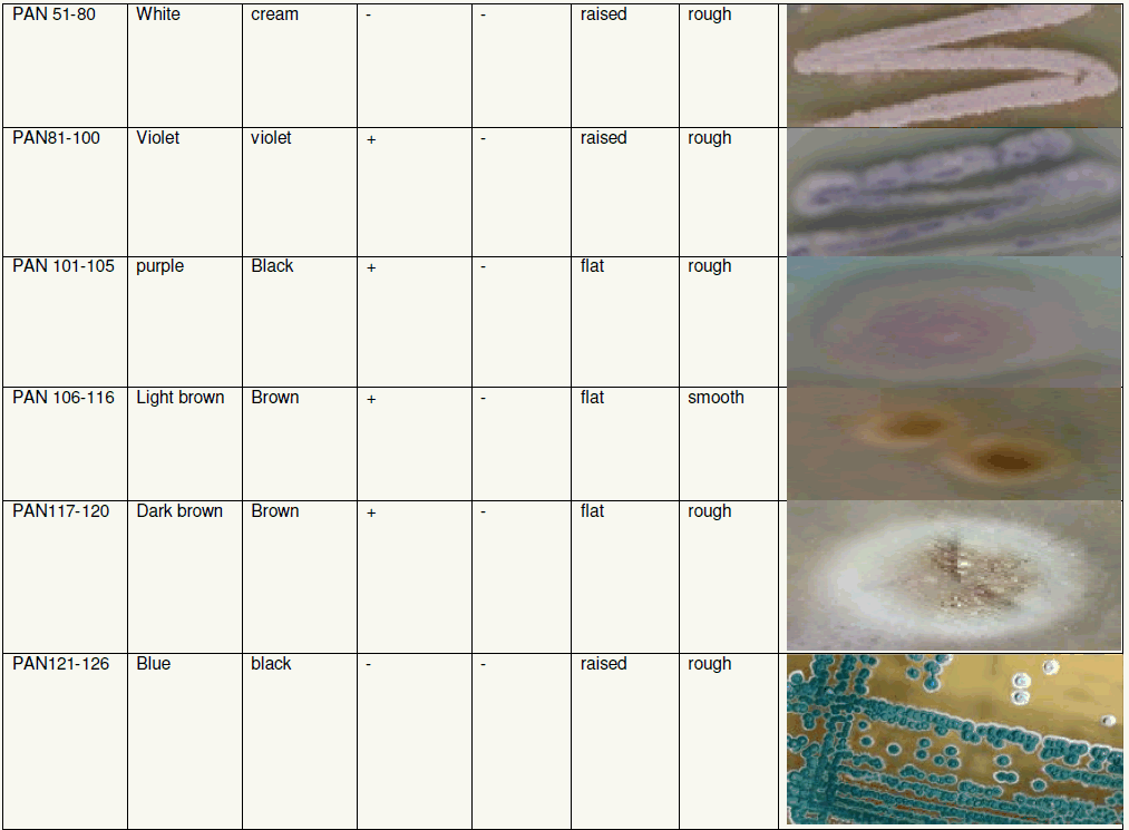 In addition, PAN 1-20, PAN 21-24, PAN81-100, PAN 101-105, PAN 105-116, PAN 117-120, PAN 121-126, PAN 127-130, PAN 131-133, PAN 134-138 and PAN 139-152 were positive for citrate utilization. Only PAN 35-50 and PAN 51-81 tested negative for citrate utilization. When tested for H2S production, PAN 35-50, PAN 51-81, PAN 117-120, PAN 121-126, PAN 131-133 were positive while PAN 1-20, PAN 21-34, PAN 81-100, PAN 101-105, PAN 106-116, PAN 127-130, PAN 134-138, PAN 139-152 tested negative.