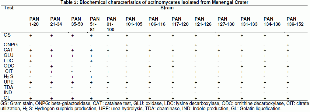 Biochemical characteristics of actinomycetes are used in their identification. The microorganisms isolated in the current study produced biochemical characteristics that are typical of actinomycetes (Table 3). The results concurred with a previous study that was carried out in Tamilnadu, India (Cholarajan and Vijayakumar, 2016). This may have resulted from the isolated actinomycetes strains been the same (Basha et al., 2017).