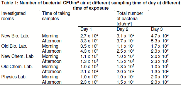 Bacteriological quality assessment of indoor air study is one of the most vital investigations to determine the microbial indoor air contamination. The information on the indoor microbial concentrations of airborne bacteria is necessary both to estimate the health hazard and to create standards for indoor air quality control. The concentrations of bacteria aerosols in the indoor environment of Science laboratories, estimated with the use of the settle plate method, ranged between 1.0 x 102 - 5.3 x 102 cfu/m3