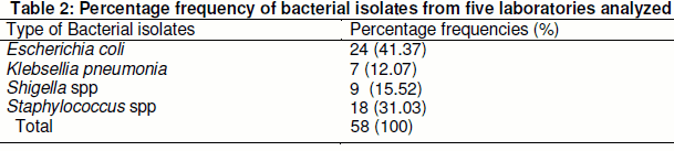 The study showed that out of total 58 bacterial isolates obtained in the study, Escherichia coli has the highest occurrence 24(41.37) followed by Staphylococcus spp18 (31.03), Shigella spp 9 (15.52), and Klebsellia pneumonia 7 (12.07) has the least. These isolates are commonly found bio aerosols and pathogens in the air. This is because the carriers are commonly present in the area under study. This supports previous studies which state that Staphylococcus sp is the frequently commonly found pathogen in air (Kalwasinska et al., 2012).
