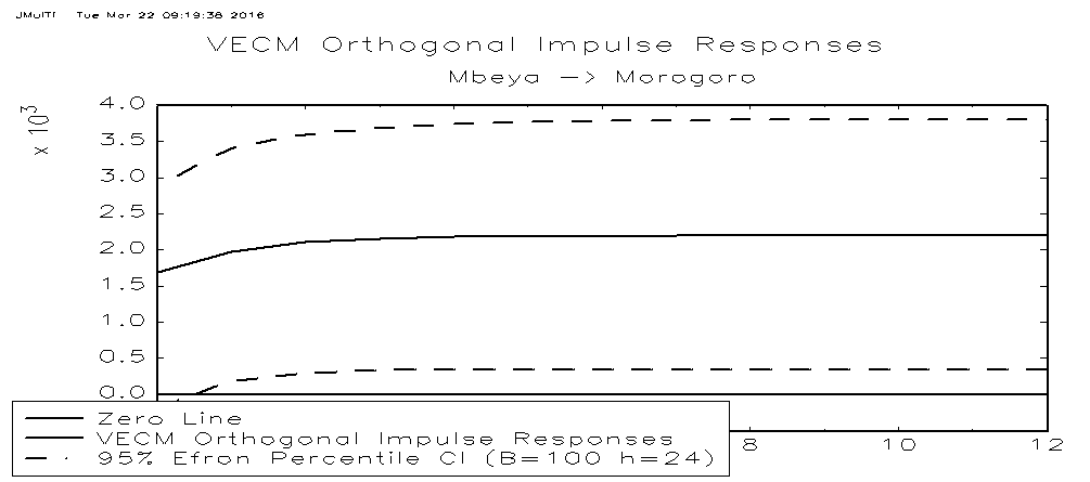 Based on variance decomposition analysis, the results reveal t the predominant sources of price fluctuations across markets are due largely to own shocks and Dar market, to a very small degree, shocks are coming from the rest as it is indicated in Annex 2 (Table 5). This implies that Dar-es-salaam as a major consumption market has a significant position in influencing the rice price behavior in Tanzania and can be used to predict future prices.