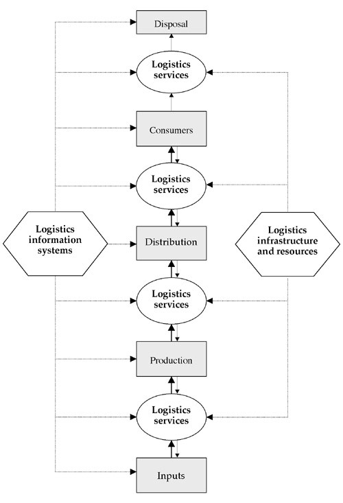Figure1 below provides an overview of the logistics system. Logistics services, information systems and infrastructure/resources are the three components of this system and are closely linked. The interaction of the three main components in the logistics system is interpreted as follows. Logistics services support the movement of materials and products from inputs through production to consumers, as well as associated waste disposal and reverse flows. They include activities undertaken in-house by the users of the services (e.g. storage or inventory control at a manufacturer’s plant) and the operations of external service providers.