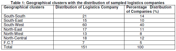 Seven clusters were randomly selected for sampling in the study. These are: South-South region; South-East region; South-West region; North-East region; North-West region; North-Central region; and FCT. These clusters represent the Nigerian geo-political zones and highlight the main distribution of Logistics companies around the country. The annual turn-over of the companies sampled was used as the selection criteria. This was used to determine the sample size in each cluster. The collected questionnaires indicated a total of 1634 Logistics service providing companies in Nigeria. The first characterization of the companies examined shows large sized companies with an average turnover of 32 million Naira and over 200 employees and an average Logistics investment of 5 percent of the total turnover, spanning all sectors of business in Nigeria. This characterization agrees with the results reported by Chuang et al. (2007) which identify company size as a key factor in Logistics service adoption. A total of 151 companies met the above criteria and were selected for the study.