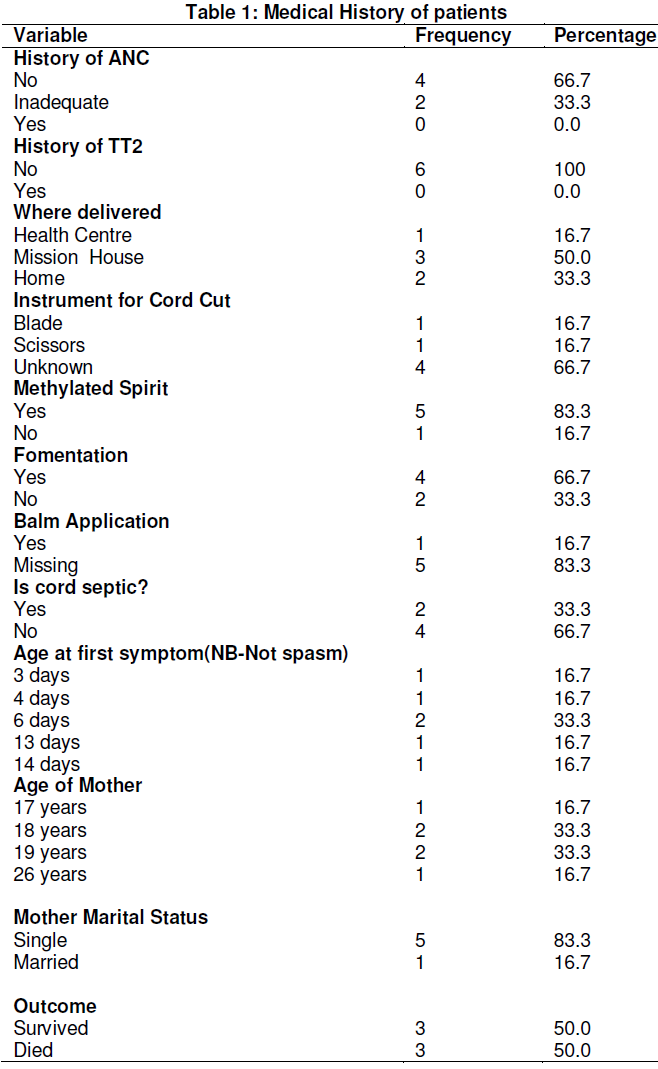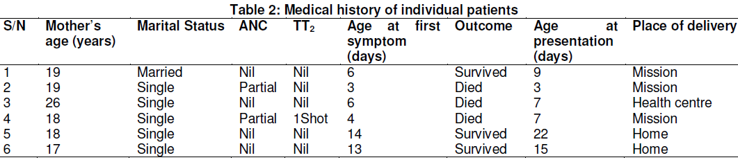 While 4 (67.7%) of the patients had a history of fomentation done on their umbilical cords, 2 (33.3%) had septic umbilical cords on admission and only 1 (16.7%) was delivered in a health facility. In table 2, three of the patients were delivered in religious centres called mission homes. Five (83.3%) of the mothers were teenagers and unmarried, 2 (33.3%) had partial antenatal care, 4 (67.7%) had no antenatal care while none of them received up to 2 doses of tetanus toxoid vaccine. The mortality rate was 50% as 3 of the patients died while 3 survived.