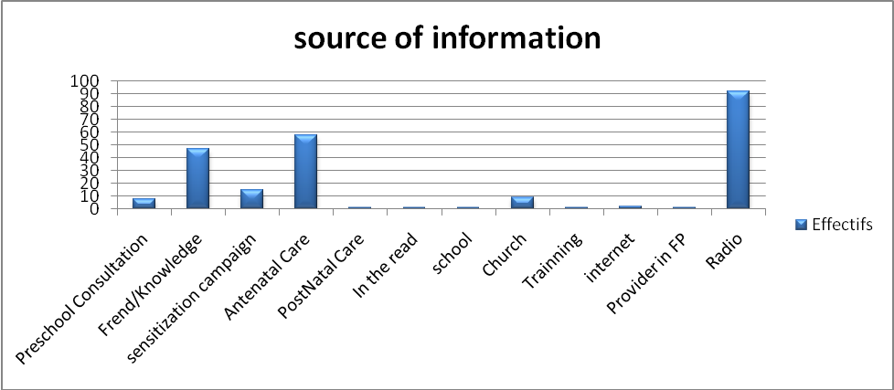 2. Figure 1 shows that in Kadutu, more than a quarter (92/267) or 34.5% received information about family planning on the radio, followed by those who have received the ANC (58/267) is 21.7%, these two are the biggest sources of FP information in this country. Other sources of information forms the remaining proportions and most are insignificant. It is too bad that radio informs a sufficient number of people even when journalists do not undergo training in this area, and may distort the message leading to all possible consequences. These results are similar to those found in Benin in 2002, which found that the two main sources of information are the radio and social agents (Borgou and Alibori, 2002). In principle, reproductive health providers involved in community shifts should be the main sources of information on FP, since they the ones who are trained and know how to convey the message to the target population.