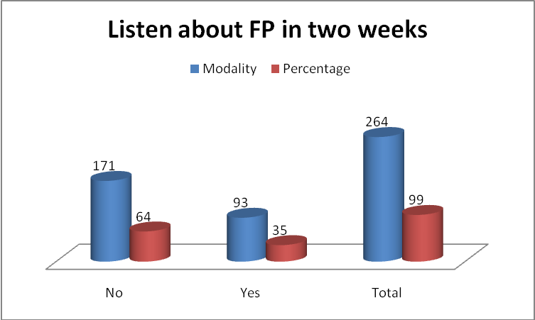 Figure 3 shows that over half (171/267) or 64% of respondents have already heard about FP and nearly half (93/267) 35% have never heard, there is a big gap to fill in this country. Rozina Mustafa study and his collaborators done in Pakistan have had a contrary result from ours (Rozina, 2008); note that they have conducted their study in a rural area.