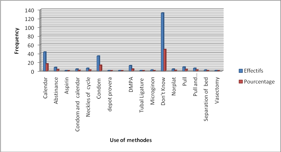 Figure 6 shows that almost half of the respondents, 49% (132/267) did not know about the contraceptives methods. The calendar methods which is also called natural method is known by 16% (43/267), 13% (34/267) knew about condoms, 4% (12/267) knew about DMPA (Acétate de Medroxy Progésterone Retard) , 3.3% (9/267) knew about the use of pills, 3% (8/267) knew about abstinence, 2.3% (6/267) knew about pills as wells as others methods like condom, calendar and injection and 2% ( 6/267) knew about the necklace of the cycle. Unfortunately some people think that aspirin can prevent conception or to keep towel cloths of menstruation without washing them can prevent conception. The first group has an odd knowledge and for the second group has the bases of their knowledge on customs, showing that South-Kivu customs continues to blind the population. A study done in Malian in 2012 publishes a similar result (Leon et al; 2012). Our worry is to realize that nearly half of the correspondents do not know contraceptive methods while in zone where there are many partners who promote this activity and several community sensitizations are done. In general view, many do not actually see the differences in the use of contraception, including modern contraception, but some contraceptive methods are more used than others (condom and calendar).
