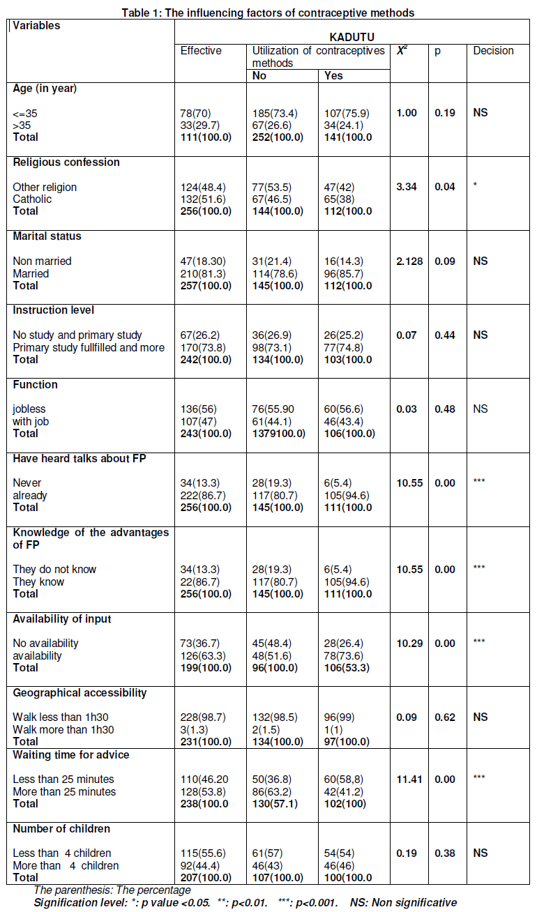 Among the respondents who used contraceptive methods, 99% have at least a half hour walk to get to the clinic FP and 1% have more than a half hour walk to get to the clinic of FP. There is no existing statistically significant link between the geographical accessibility and use of contraceptive methods in Kadutu (p> 0.05). Niyat Bangamboulou and his collaborators have found that it is the lack of information on these methods, the lack of FP centers and qualified personnel in FP as well as the cost that are causing this problem (Niyat et al., 2004).