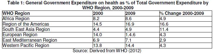 Accordingly, to the WHO (2015), 15.6% of Total Government Expenditure was spent on health worldwide in 2013. Table 1 shows general government expenditure on health as a percentage of total government expenditure by WHO Region. It is evident that most Regions recorded an increase in government expenditure on health as a percentage of total government expenditure during 2000 and 2009, albeit the increases were very small. Most Regions recorded less than 1 percentage point increase during the 10 year period. Only the Region of the Americas and Western Pacific Region increased their expenditure on health by more than 1 percentage point. In terms of % change from 2000 to 2009, no WHO Region recorded a decline in General Government Expenditure on health as a percentage of Total Government Expenditure during the 2000-2009 period. On the contrary, all the Regions increased their General Expenditure as a percentage of Total Government Expenditure, with the Region of the Americas recording the highest increase of 16.6% while the Eastern Mediterranean Region recorded the lowest increase of 2.9% (Table1).
