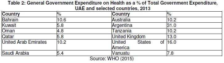 Table 2 shows government health expenditure as a % of Total Government Expenditure in the UAE and the GCC compared with selected other countries. UAE (10.2%) and Bahrain (10.6%) recorded the highest general government expenditure on health as a % of total government expenditure in the GCC. Oman and Saudi Arabia recorded the lowest proportions of government expenditure on health. Elsewhere, Argentina recoded some of the highest general government expenditure on health as a % of total government expenditure (31%).