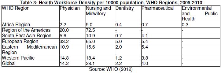 Within the realm of resources, another key indicator or factor for sustainable health care is the health workforce. Table 3 shows the health workforce for various WHO Regions during the 2005-2010 period. With the exception of European Region and Region of the Americas, all other Regions recorded lower density per 10,000 population than the global averages.
