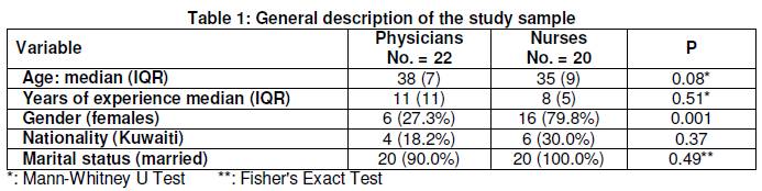 Median age was 38 for physicians and 35 years for nurses and female gender was presented in 27.3% of physicians and predominated in nurses (79.8%) (p = 0.001). Physicians had insignificant longer periods of experience than nurses (median = 11 versus 8 years). Kuwaiti nationality was presented in 18.2% of physicians and in 30.0% of nurses, and married subjects represented 90% and 100% of physicians and nurses respectively without a significant difference (Table I).