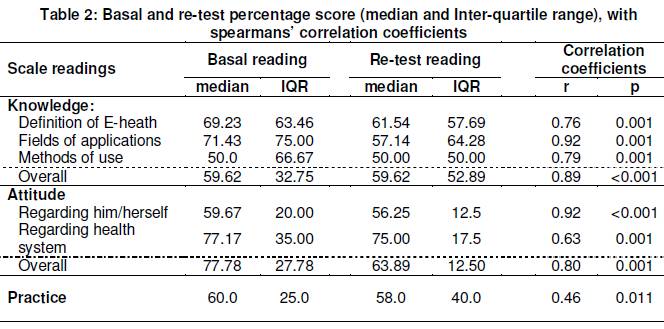 Conclusion: The questionnaire was reliable and valid for assessing knowledge, attitude and practice of e-health among health care providers.