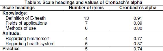 were 0.91, for 13 definitions of e-health items, 0.89 for 7 fields of use of e-health items, and 0.79 for 6 methods of use of e-health items. Regarding the attitude scale, Coefficients of Cronbach’s