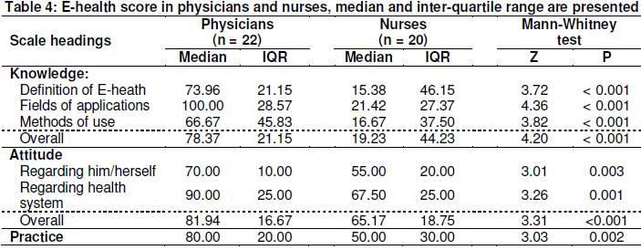 Discriminant validity is designed to test, in our case, the ability of the questionnaire to prove the predetermined hypothesis that there was a difference between physicians and nurses regarding impact knowledge, attitude and practice towards e-health. In terms of discriminant validity, significant differences between groups were observed in all domains of the studied aspects with higher scores in physicians than nurses.