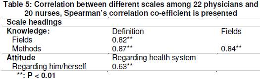 were 0.77 for 4 items related to participants’ attitude toward him/her selves and 0.87 for 5 items related to participants’ attitude towards health system. However, a lower coefficient (0.74) was detected in case of 5 items of practice domain. (Table III).