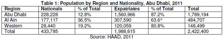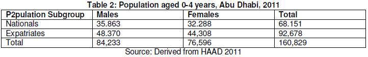 Of the total population of 2,422,400 living in Abu Dhabi in 2011, 160,829 (6.6%) were in the early years age group, i.e. 0-4 years old. As indicated in table 1, the early years population consisted of 84,233 males (52.4%) and 76,596 females (47.6%). In addition, the 160,829 0-4 years population comprised 68,151 Nationals and 92,678 Expatriates. Therefore, about 57.6% of the Abu Dhabi population aged 0-4 years old were born to the Expatriate population.