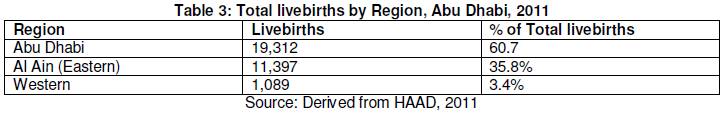 Table 3shows total livebirths in Abu Dhabi by Nationals and Expatriates in 2010 and 2011. In 2010, Abu Dhabi recorded a total of 29,528 livebirths and this increased to 32,084 in 2011, an increase of 8.7%. 51% of the livebirths in 2011 were males compared to 49% females. The distribution of livebirths by Region is indicated in table 3, with Abu Dhabi City accounting for over 60% of the births.