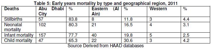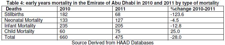 Data used in this study have come from the statistical resources of the Health Authority Abu Dhabi (HAAD), albeit some routine data have been obtained from other sources. The data include information on the population, stillbirths, neonatal mortality and child mortality for 2010 and 2011.The methodology involves an epi-statistical analysis of mortality data. This includes the computation of various indicators of mortality for the 0 to 4 years age group and a comparative analysis by geographical region. A comparison of early years mortality in 2010 and 2011 is also undertaken.