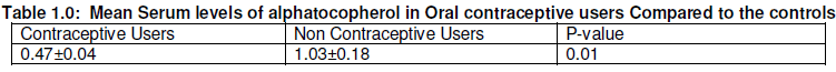 In conclusion, considerable decrease of alphatocopherol was observed among the contraceptive users compared to non contraceptive users in Sokoto metropolis Nigeria.