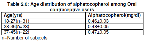 Cite this Article: Muhammad Y, Kani YA, Umar FA and Zainab I (2017). Deficiency of Serum Alphatocopherol among Oral Hormonal Based Contraceptives Users in Sokoto Metropolis, Nigeria. Greener Journal of Medical Sciences, 7(3): 032-035, http://doi.org/10.15580/GJMS.2017.3.052117065