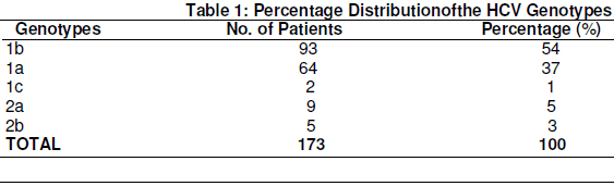 In conclusion, the findings of the present study revealed that 93 (54%) patients were infected with genotype 1b, followed by 1a with 64 (39%), 1c, 2a and 2b with 2 (1%), 9 (5%) and 5 (3%) respectively. However, genotype 1b was found to have the highest prevalence, while 1c with lowest number of infected individuals. Moreover, in all the ranges of viral loads in the study, 1b genotype was found to have highest prevalence.