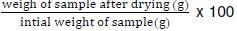 Moisture content (%): Moisture was determined by oven drying method. Five gram of each sample was accurately weighed in Petri dish (W1). The partially covered dish was placed in oven at 105°C for 12 hours. Then the Petri dish was placed in desiccators at room temperature for 30 minutes to cool. The sample was reweighed after cooling (W2). The percent moisture content was calculated as: