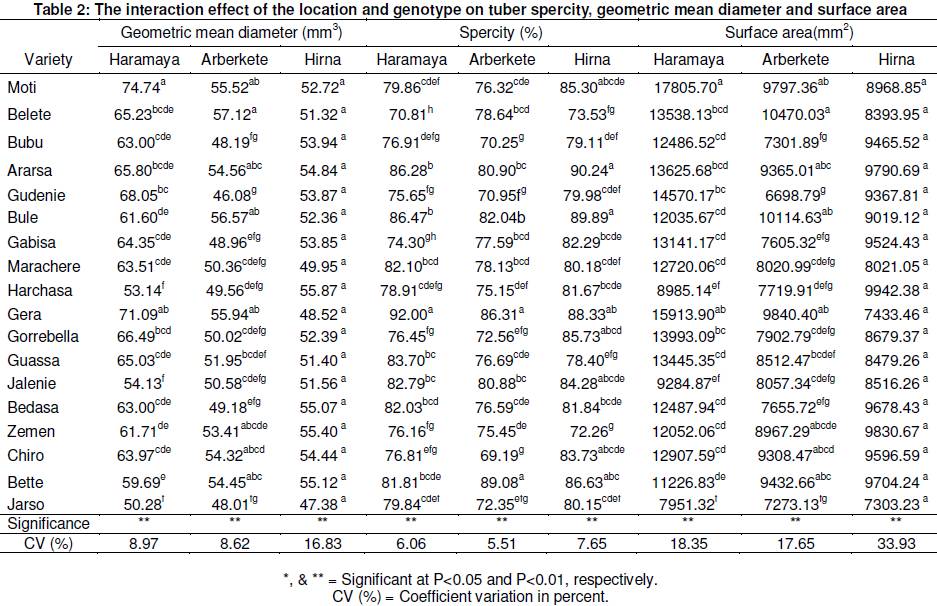 Tuber geometric mean diameter: Significant maximum tuber geometric mean diameter was recorded for Moti (74.74mm3) at Haramaya, Belete (57.12mm3) at Arberekete and Harchassa (55.87mm3) at Hirna, whereas, significant minimum tuber geometric mean diameter was registered for Jarso (50.28mm3), Harchassa (53.14mm3) and Jalenie (54.13mm3); all were grown at Haramaya, Gudenie (46.08mm3); at Arberkete and Jarso (47.38mm3) at Hirna (Table 2).