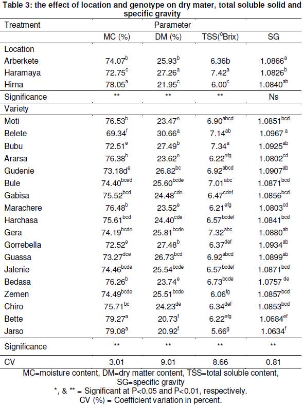 Total soluble solid: In this study, total soluble solid contents ranged from 5.660Brix for Jarso to 7.34 0Brix for Bubu variety. Other varieties viz., Gera (7.320Brix), Belete (7.140Brix) and Bule (7.010Brix), also recorded the highest total soluble solids; while after Zemen (6.060brix), Marachare (6.210Brix) and Bette (6.220Brix) registered the lowest total soluble solids. The highest mean total soluble solid for genotype was observed for Haramaya (7.42Brix) growing site; while the lowest mean total soluble solid was observed for Hirna (6.00Brix) (Table 3). According to Rex Harrill (1989), Brix equals to percentage of sucrose and varies directly with plant quality. The refractive index of potato varies from poor 30Brix, average 50Brix, good 70Brix as long to excellent 80Brix (Rex Harrill, 1989). Accordingly, all the genotypes in this study had refractive index,from average to excellent quality index in relation to the total soluble solid content.