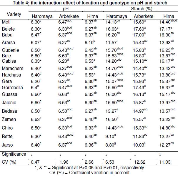 In this study, starch content and pH value were significantly affected by the genotype, location and the interaction effect (Appendix table 1).