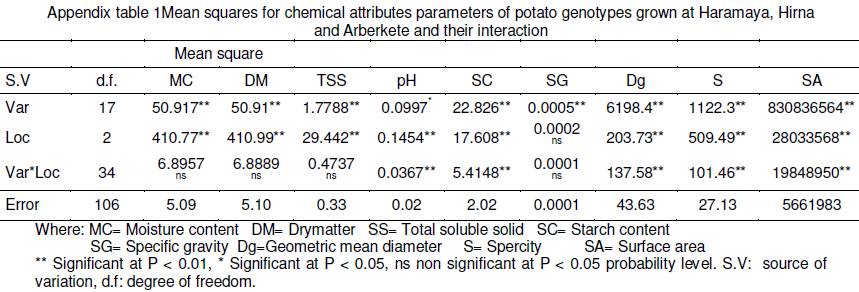 In Ethiopia, different research centres and institutions have released a number of improved potato varieties. In developing the varieties, much emphasis was given for adaptability, productivity per unit area and late blight resistance, while less or no emphasis was given to physicochemical attributes like dry mater content, total soluble solid, starch content, pH, specific gravity, tuber spercity, geometric mean diameter and surface area; which are very crucial quality parameters. Assessment of genotype × environment (including end use) interactions answers the adaptation to the environment and end uses because, it is unlikely that one of many potential new cultivars would be best in all environments and for all uses (Bradshaw et al., 2007). Therefore, an evaluation of the physicochemical properties of the varieties becomes paramount. So, this study was conducted with the following objective: