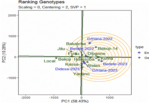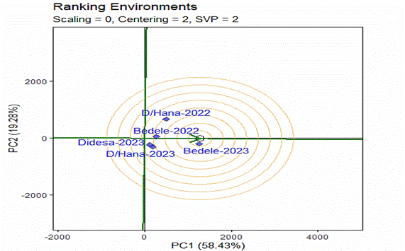 by environments that hold 26.6% of the total variation. The genotype and