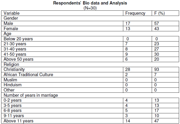 The bio data also indicates that the majority of the respondents interviewed were married for more than 11 years, as this group has the highest percentage, which is 47% followed by those who have been in marriage for between 6-8 years that had 17%, whilst those who have been in marriage for between 0-2 years and those in the 3-5years period were both 13%. Those in marriage for between 9-11 years were only 10%.