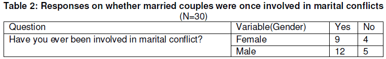 Table 2 shows that 69% of the female respondents said they had been involved in marital conflicts in their lifetime whereas 31% said they had not. On the other hand, 71% of the male respondents indicated that they had been involved in marital conflicts whereas 29% said they had not. Findings from interviews carried out revealed that the key informants have handled several cases of marital conflicts, with the Chief emphasising that it is impractically impossible to do without marital conflicts in a family. The District Victim Friendly Unit Coordinator pointed out that many of these marital conflicts arise from financial problems, infidelity, substance abuse and interference by in-laws, among some other things. Interestingly, the Pastor attributed these marital conflicts to spiritual problems.